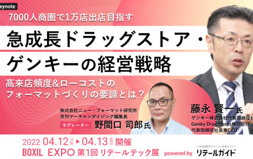 急成長ドラッグストア・ゲンキー。Genky DrugStores株式会社代表取締役社長兼CEOゲンキー株式会社 代表取締役社長である藤永氏を迎え、「7000人商圏で1万店出店目指す・高来店頻度&ローコストのフォーマットづくりの要諦」をテーマに無料講演を行います。 モデレーターは、ドラッグストア企業の専門誌「月刊マーチャンダイジング」編集長である野間口氏につとめていただきます。様々な角度から、急成長でストア展開される秘訣についてお話いただきます。 本セミナーは無料です。ぜひご参加ください。 ▶︎無料参加はこちらから その他、同時開催でファミリマート元執行役員、株式会社データ…