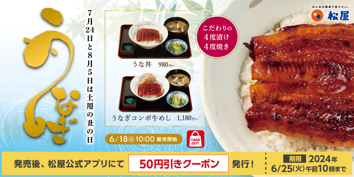 松屋フーズでは、牛めし・カレー・定食・その他丼の「松屋」におきまして、2024年6月18日(火)10時より「うな丼」を販売する。 ■外はパリっと中はふんわりのうなぎをさらに美味しく。松屋特製うなぎダレを刷新。タレをつけては焼いてを4度繰り返し香ばしく仕上げた、本格うな丼が登場 季節の変わり目の疲労回復に、土用の丑の日に先駆け、「う」のつく「うなぎ」と「牛」の最強タッグが登場する。この度、うなぎの旨味を引き出す特製のうな丼タレを刷新し、つけては焼いてを4度繰り返し行うことで外はパリっと、中はふんわりを実現した。やわらかなうなぎの旨味を松屋特製うなぎタレで引き立てる「うな丼」に、松屋の代名詞「牛め…