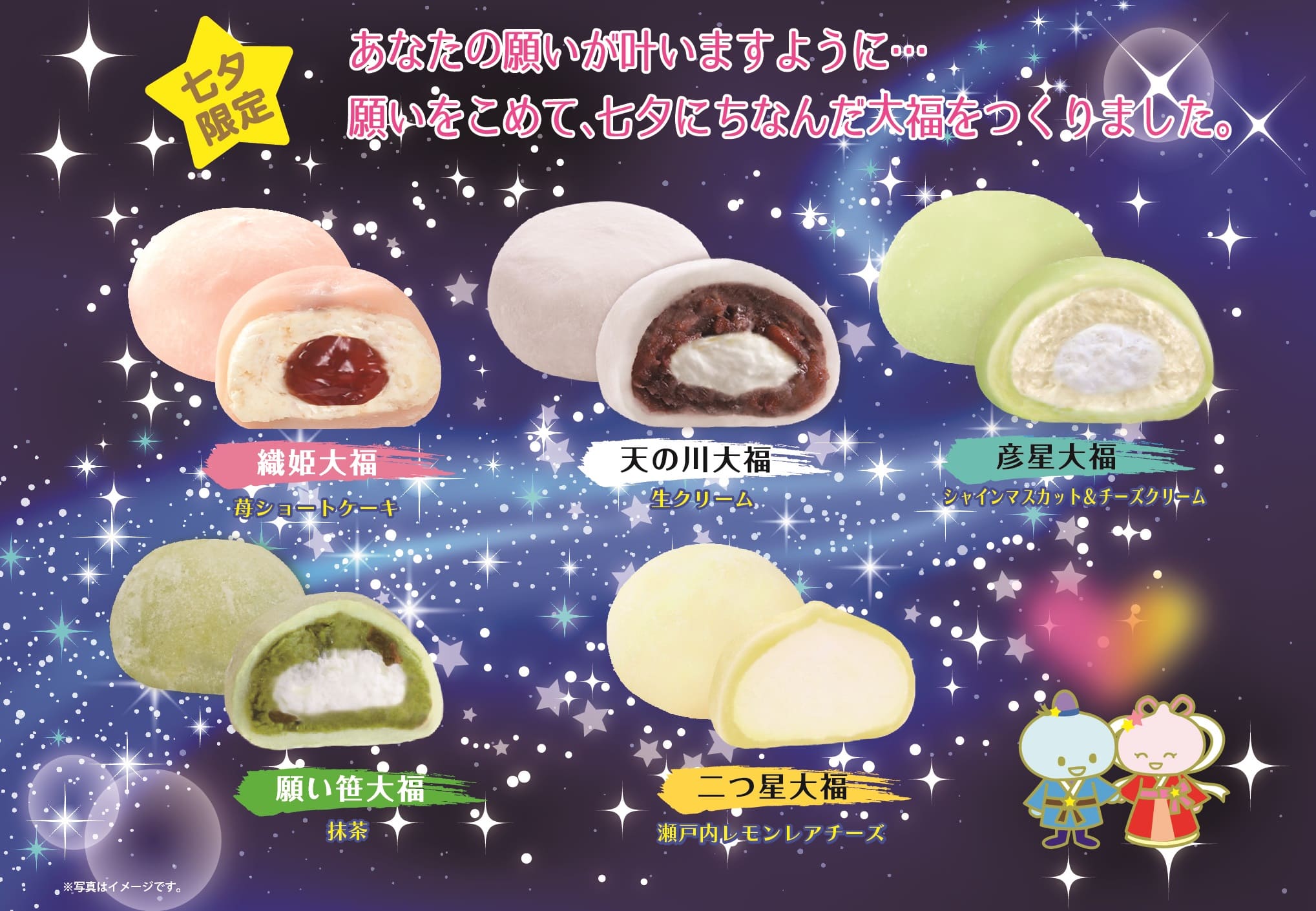イオンが「七夕大福」5品目を期間限定で発売、抹茶と瀬戸内レモンレアチーズが新たに追加