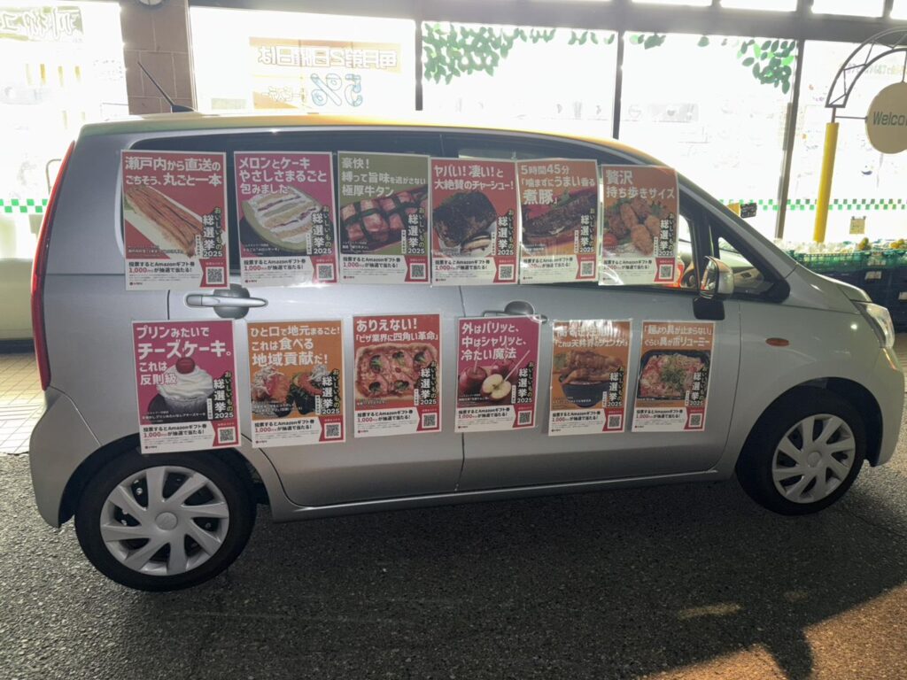 例えば、株式会社ノムラストアーはSNSに加え、店頭では大試食会、投票を促進する活動を実践するなどまさに認知から購買までをうまくつなげる展開ができているが、さらに選挙カーを意識した実際の車まで用意してしまうなど、その発想力と熱意が光った。