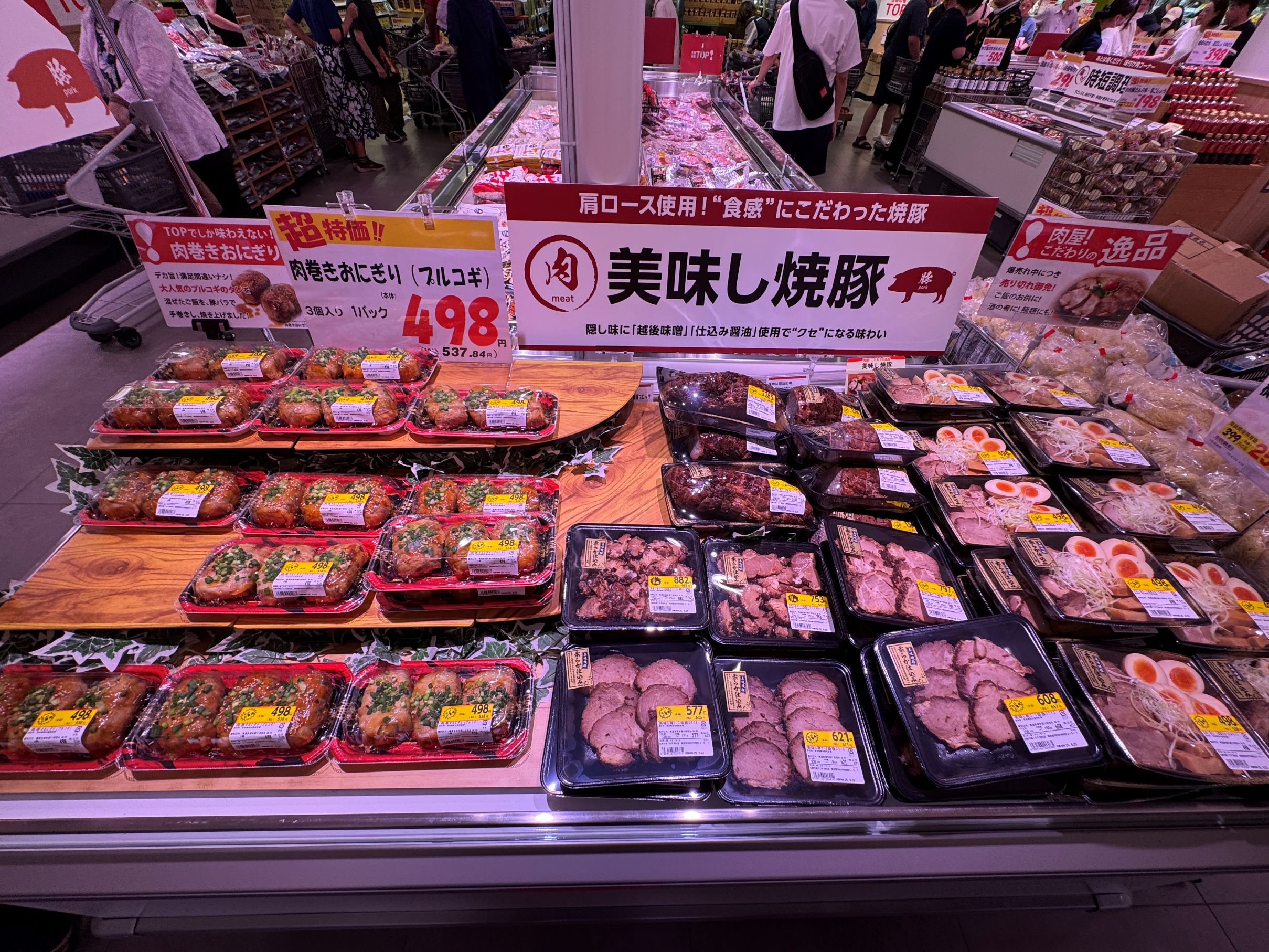 羽村店でも、既存店同様、時短や簡単便利などのニーズに応える味付け肉や自家製漬け魚を充実させている他、精肉では生鮮部門が手がける惣菜として「美味し焼豚」やローストビーフなどをおつまみコーナーとして展開する他、鮮魚でも同様に生鮮部門が手がける惣菜として寿司を展開。