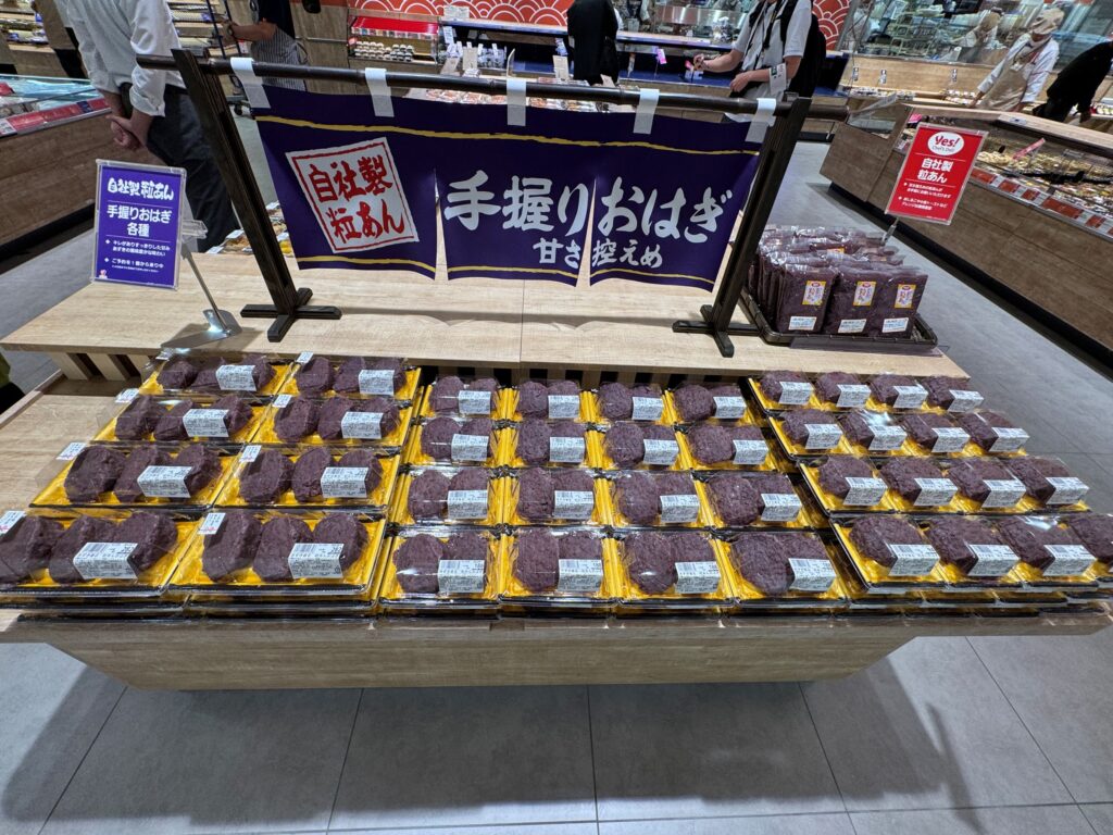 デリカの惣菜では、「手握りおはぎ」を1日を通して、粒あん、ずんだ、きなこなど選べる品揃えで展開する他、ランチタイムから夕方まで時間帯に応じた出来たて訴求を実施。駅前商圏らしく、18時以降もつまみ商品や小量目商品を選べる品揃えを実施するなど、時間帯ごとのマーチャンダイジングを強化。