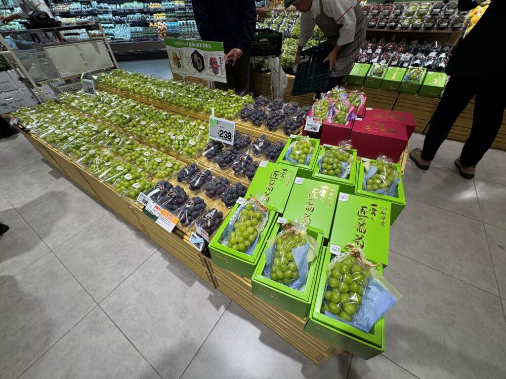 入口の平台では、季節感あふれる商品展開で、毎日楽しんでもらえる売場を実現する。今回のオープンに際しては、旬のブドウを強化し、品種を多数品揃え。従来からの百貨店の客層を意識した品揃えといえる。