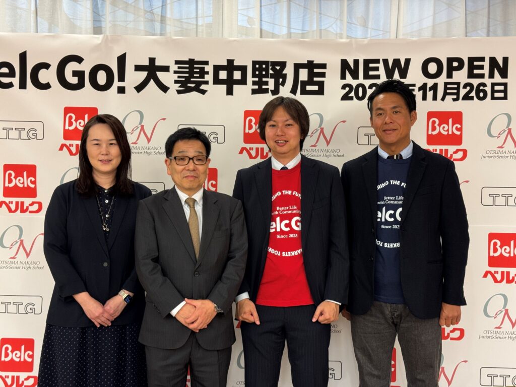 ベルクゴーのオープンの記者発表に臨んだ阿久津智紀・TOUCH TO GO社長(右端)、須川智之・執行役員財務経理部長(右から2人目)、諸橋隆男・大妻中野中学校・高等学校校長(左から2人目)、五反美千代・同教頭(左端)