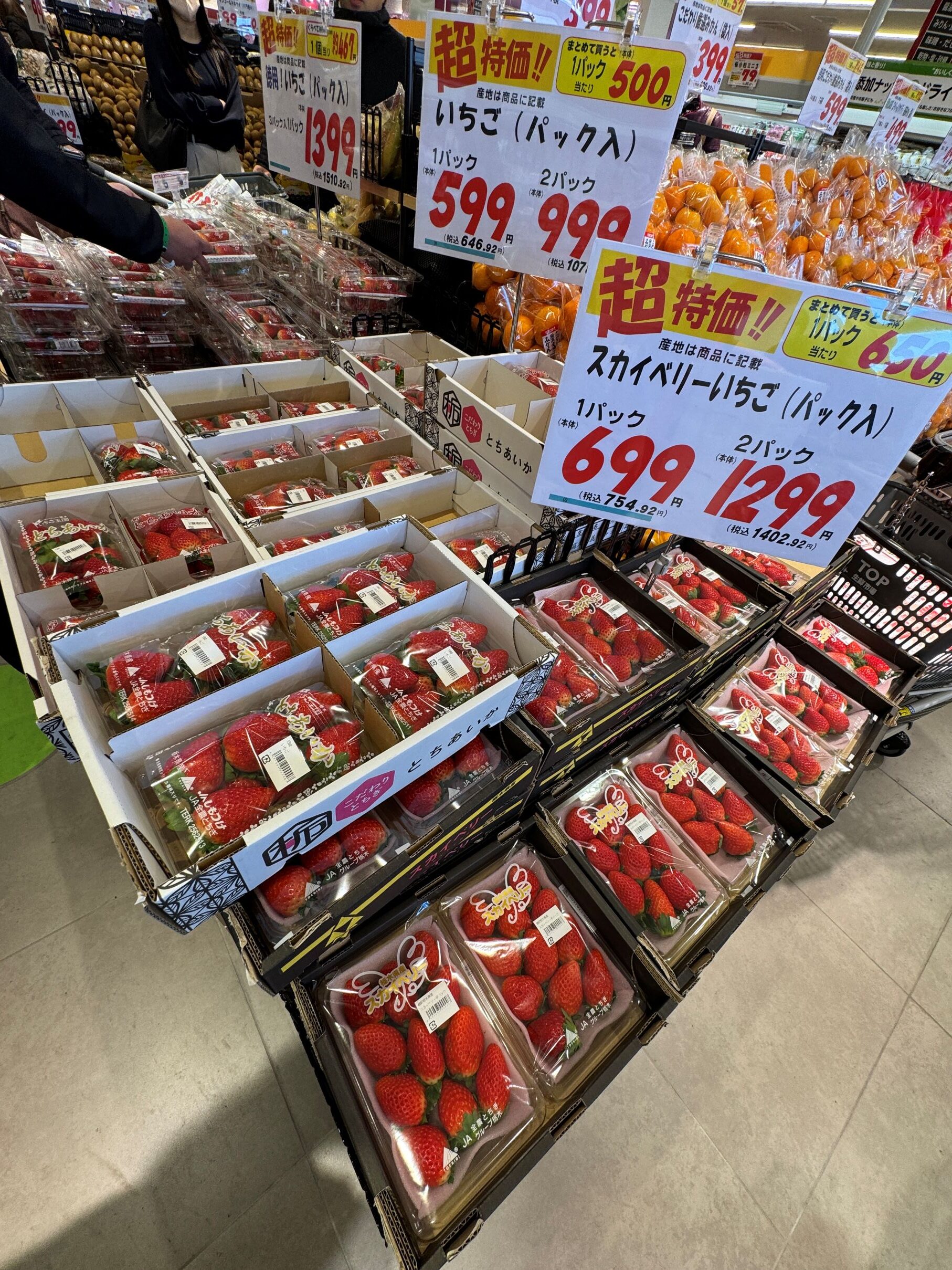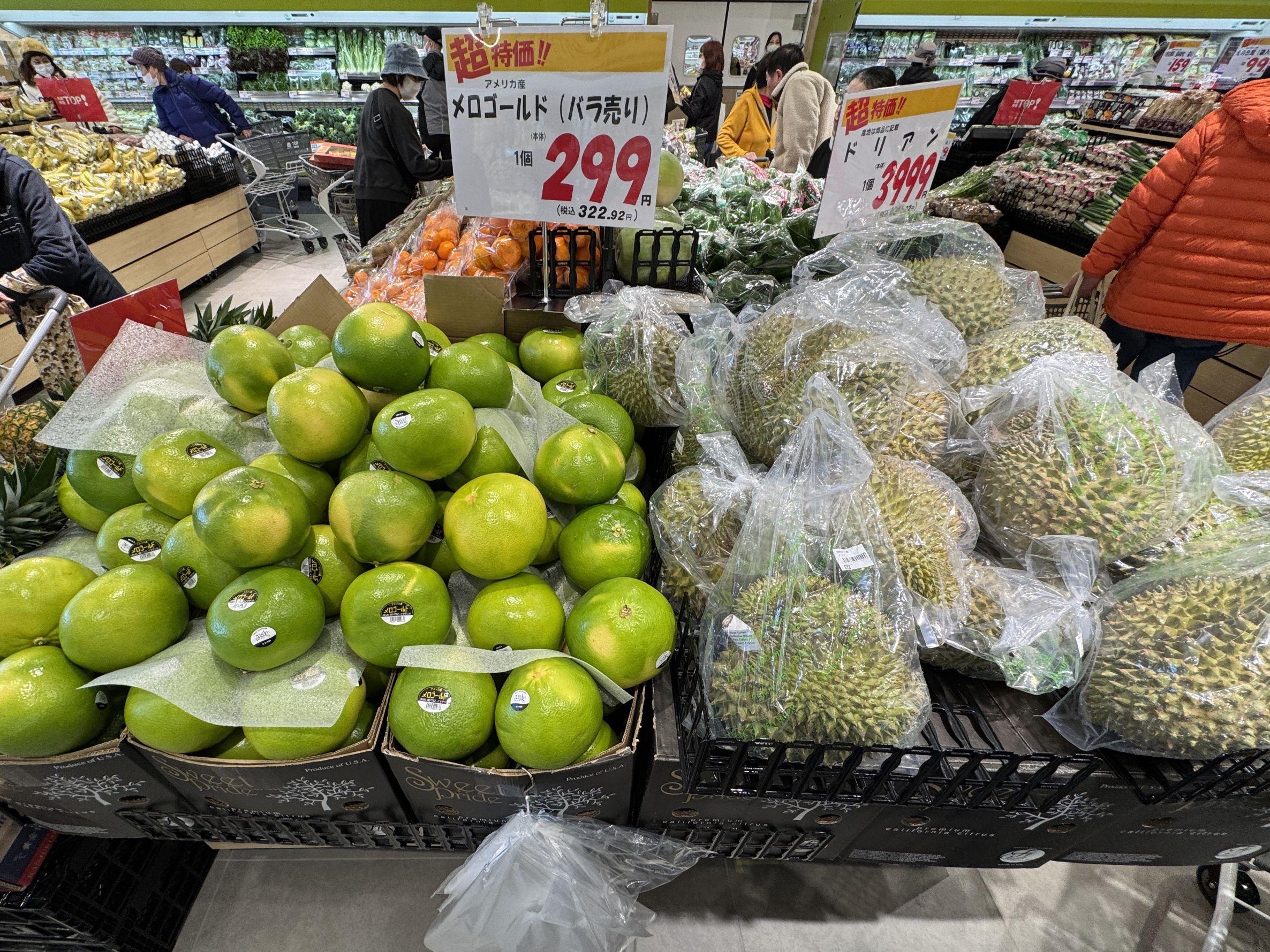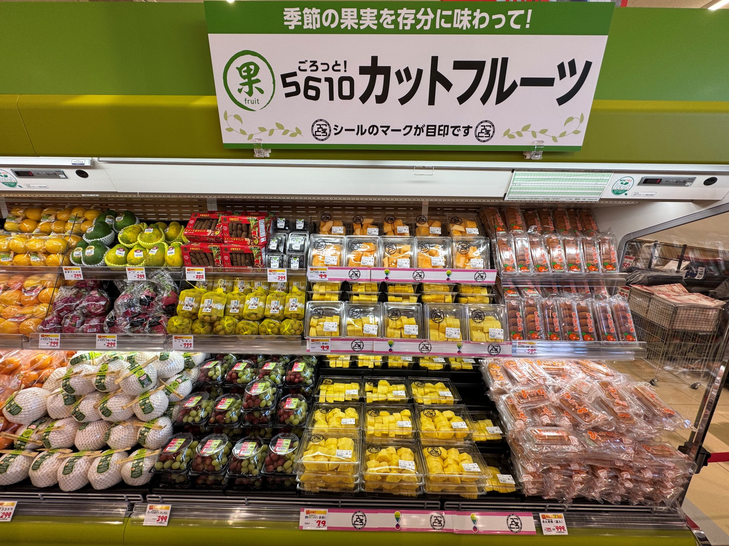 売場レイアウトは既存店同様、入口を基本的に1カ所にしたワンウエーコントロールを採用。売場先頭の青果では料理好きやプロの料理人も満足できる大容量のケース売りやまとめ売りを多用する他、品揃えにも注力。旬の野菜や果物、需要が高まるキノコ類に加え、海外の果物の品揃えも強化している。