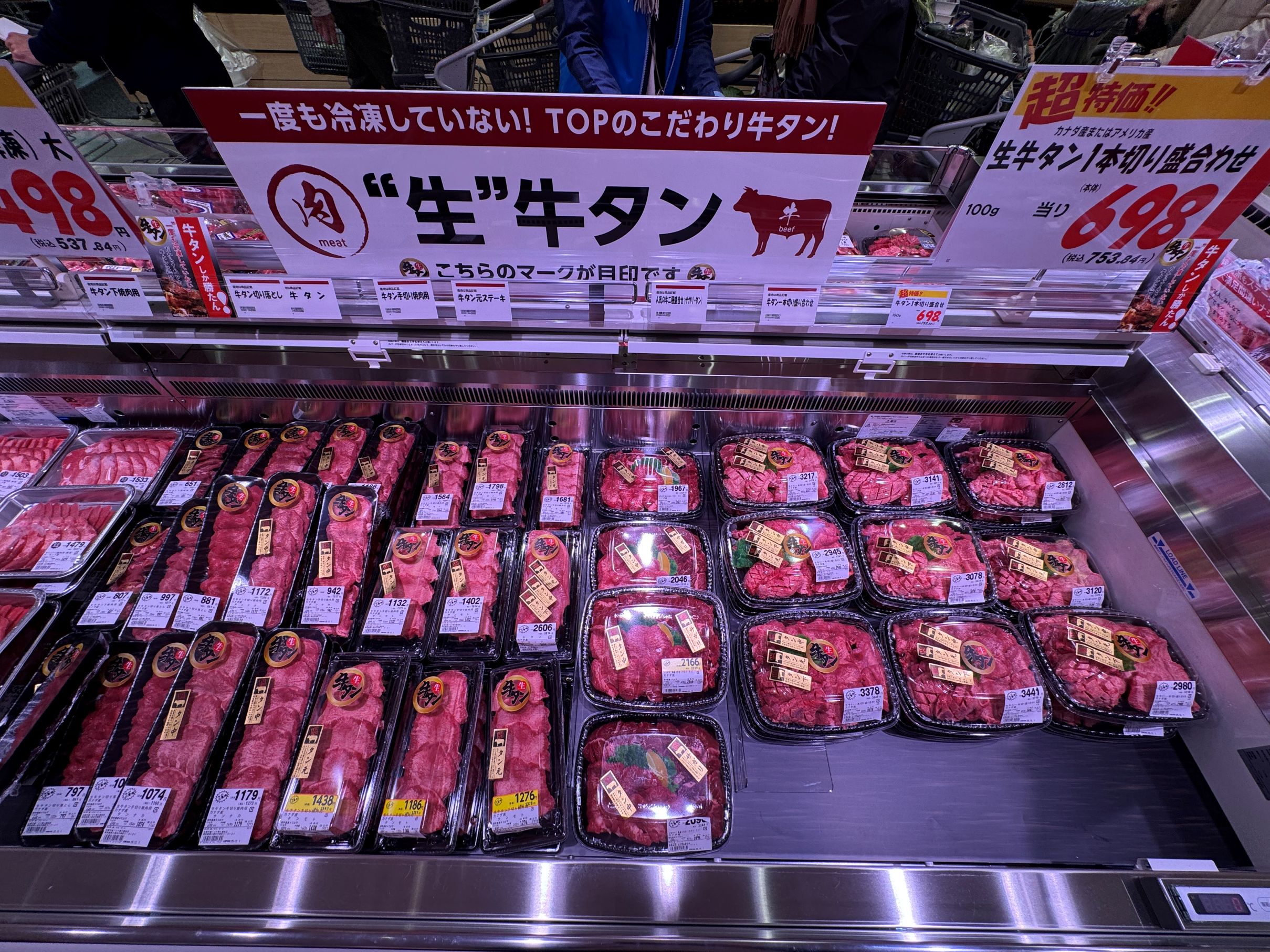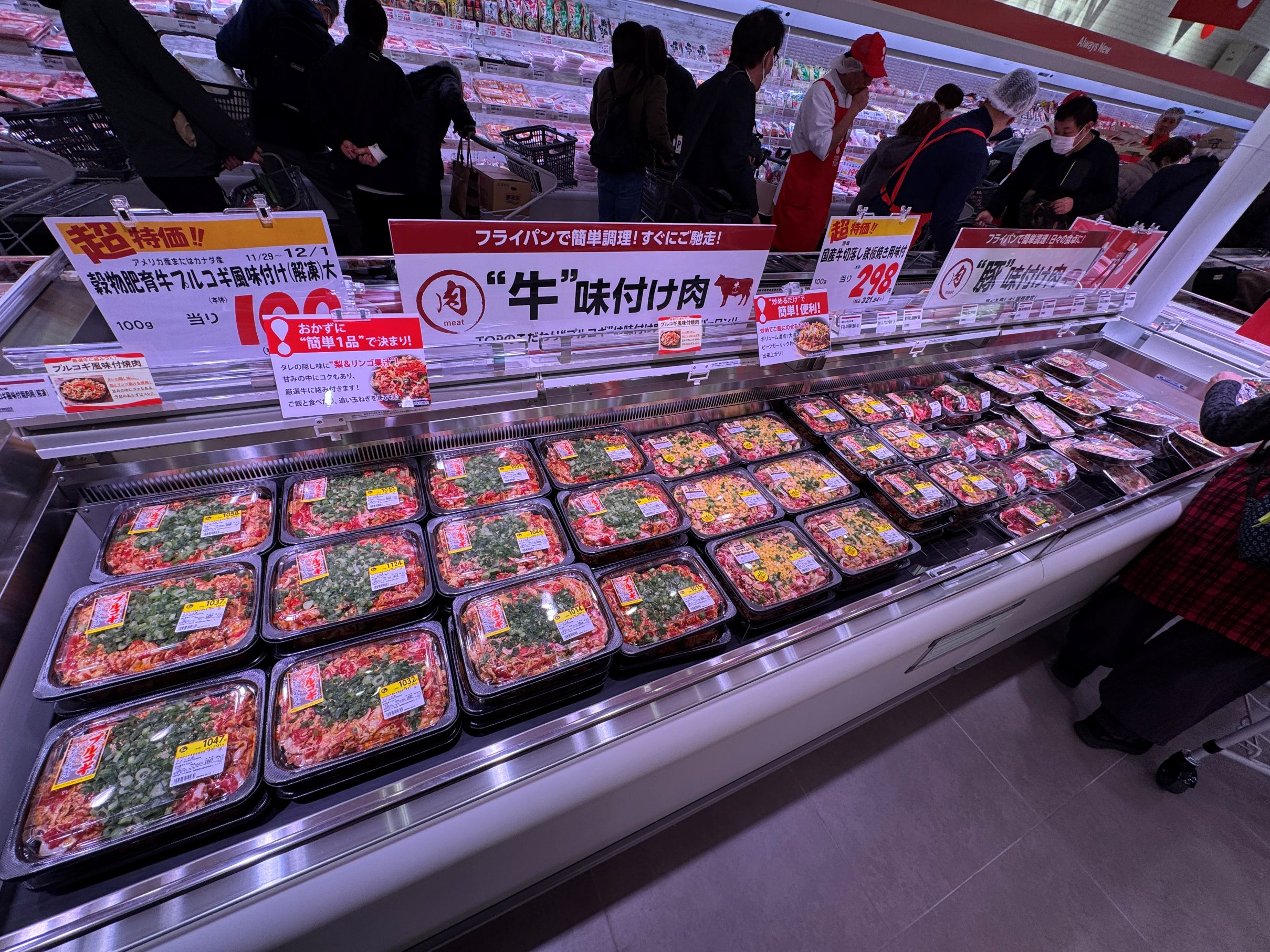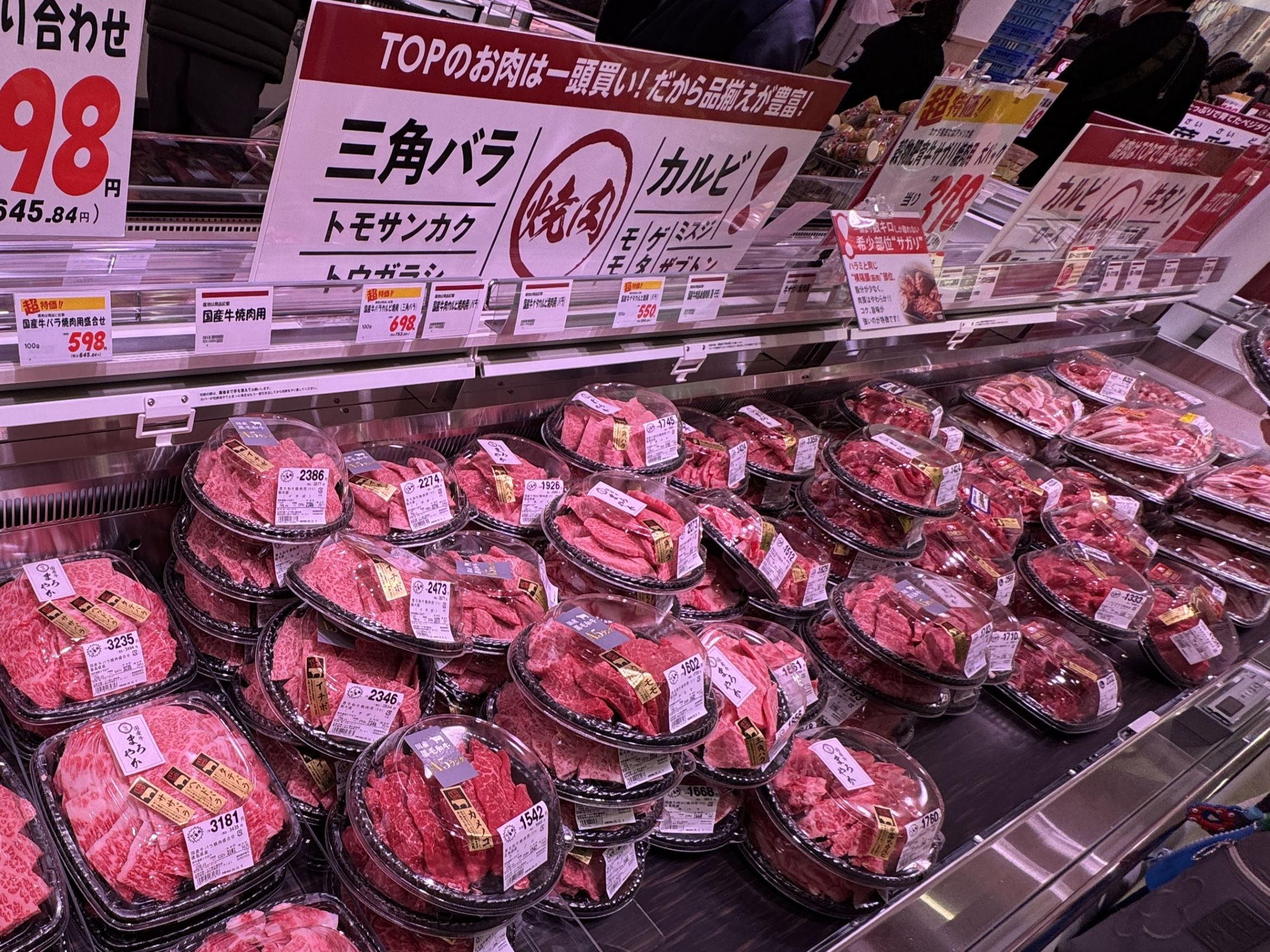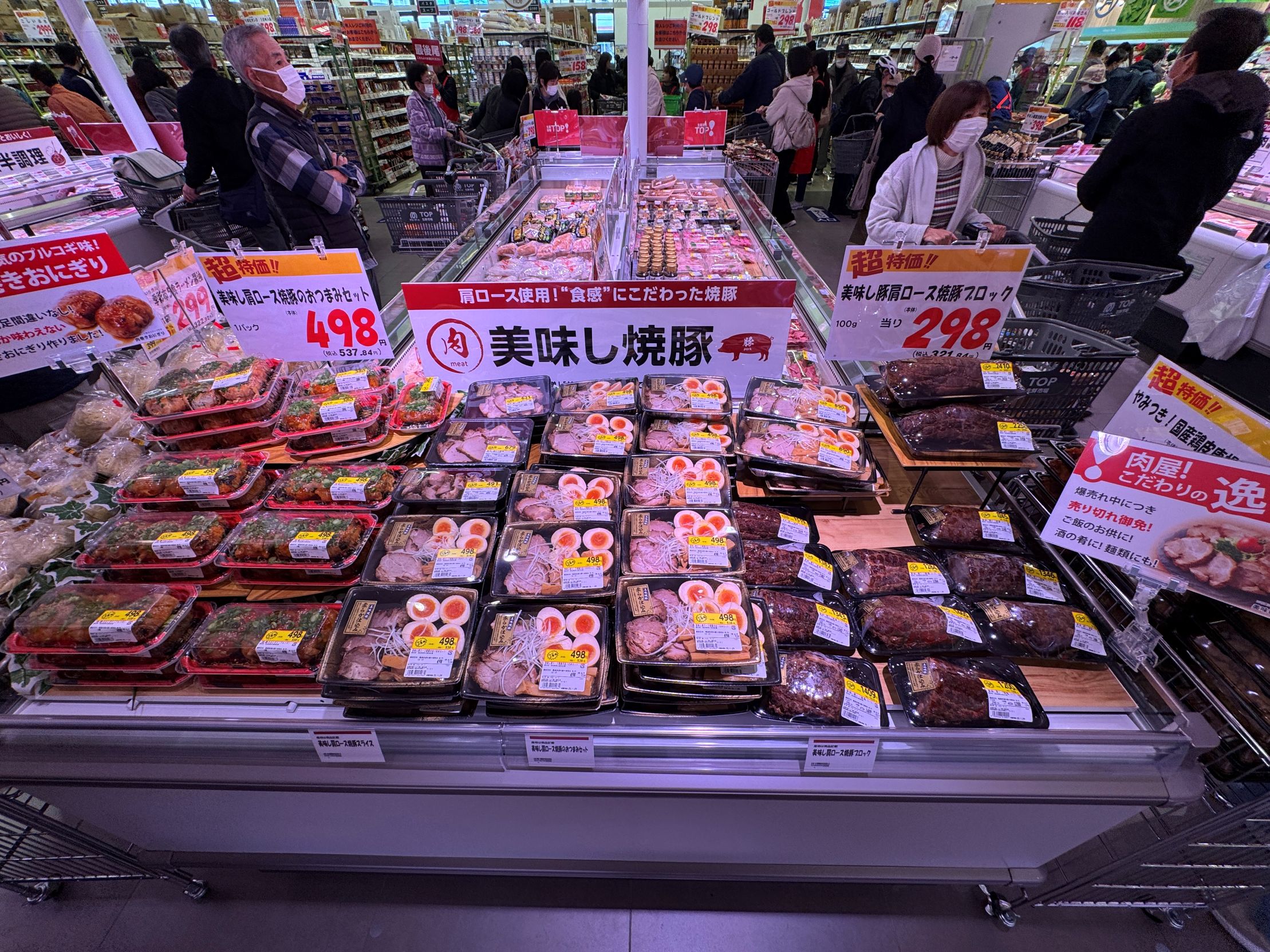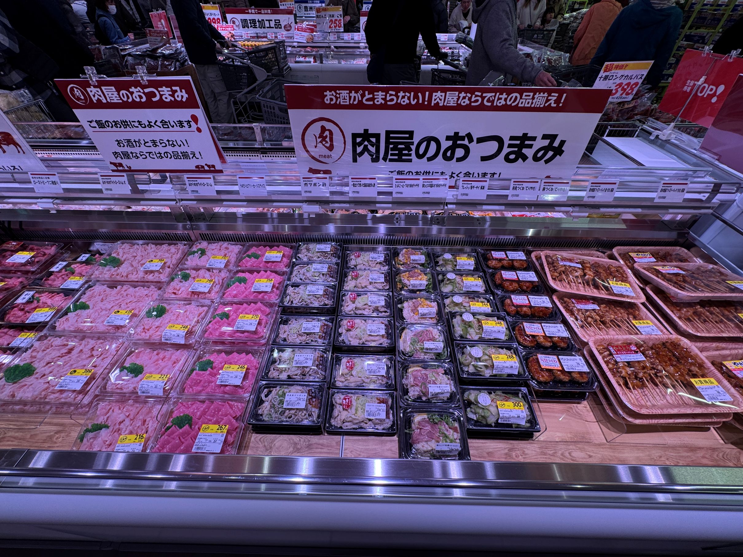 主通路沿いに青果に続き、置く壁面と平ケースで大々的に展開される精肉は、生鮮市場TOP!としての核売場といえる。国産牛を1頭買いすることで希少部位まで取り扱いができる他、多様な商品化で売場のデスティネーション化を図る。特にラム、牛タン、さらに昨今は内臓系も含む味付け商品など、特定カテゴリーについては品揃えを広げて、「これを買うなら生鮮市場TOP!で」という想起を生み出そうとしていることが伝わってくる。