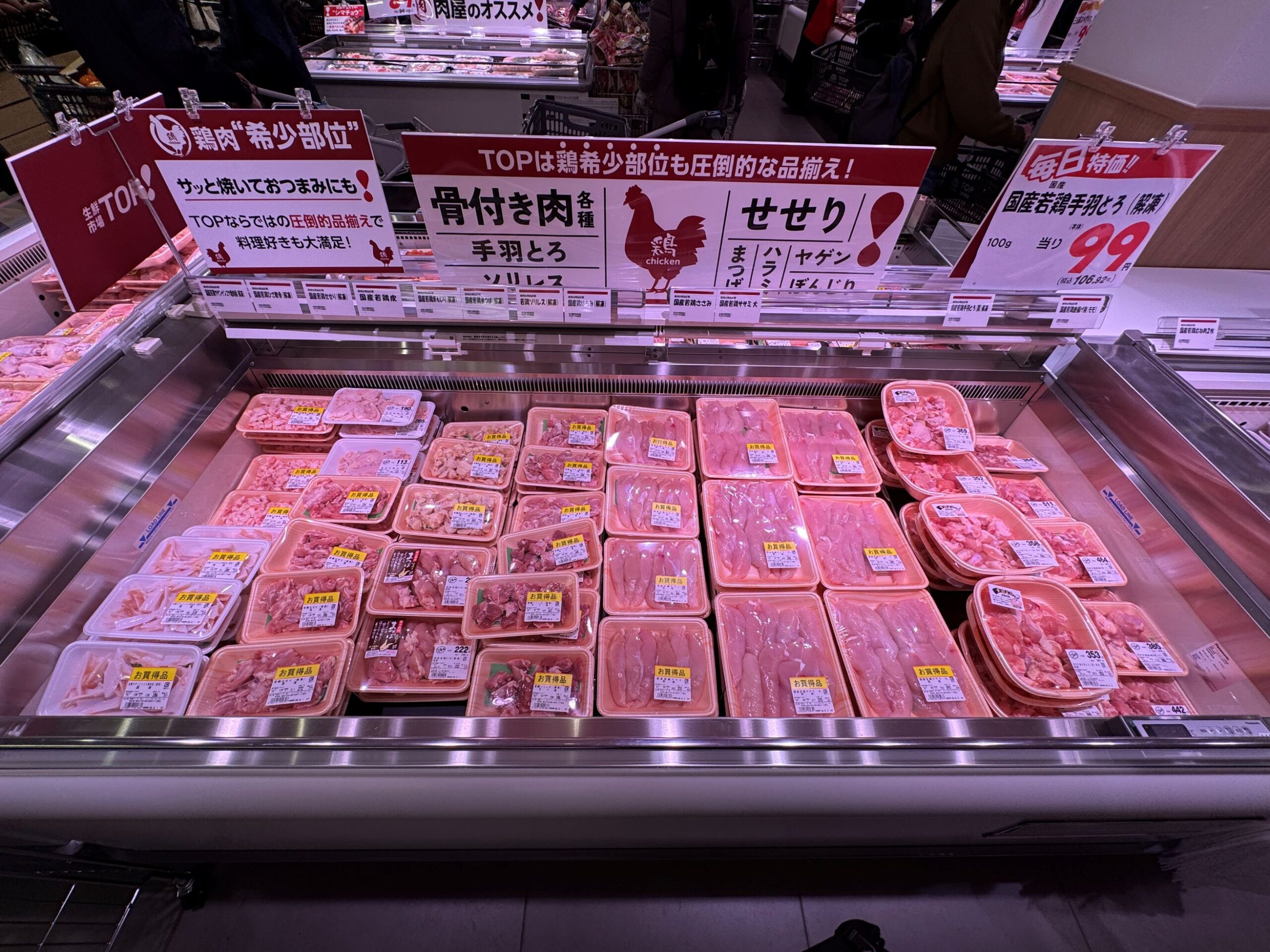 商品も、さまざまな部位を訴求しながら商品化を分けたりしていて、お客が売場でじっくり選んでいる場面をよく見る。これは意図的なもので、売場を素通りすることなく、さまざまなところで立ち止まって、興味を持ってもらうことを狙っている。