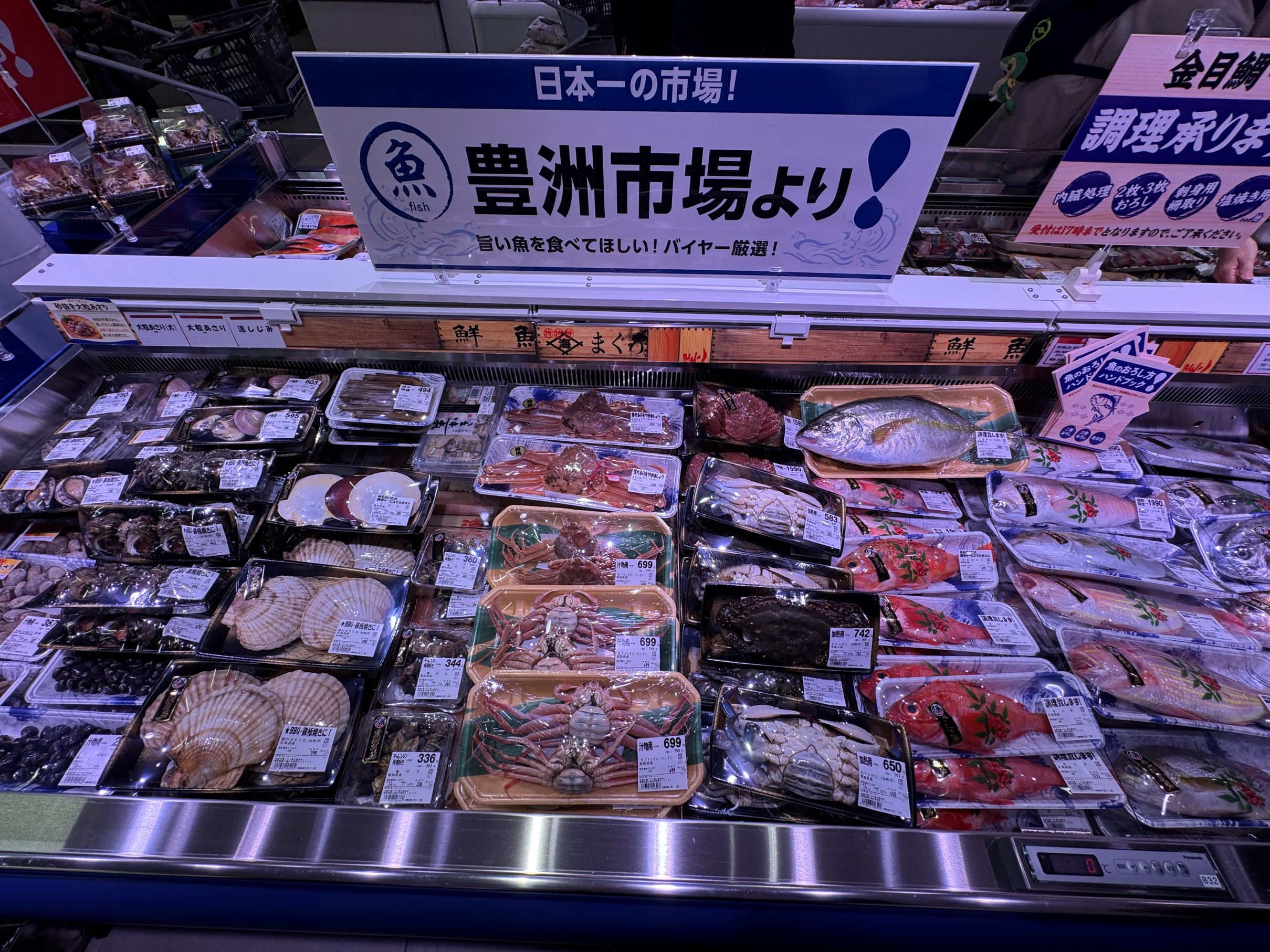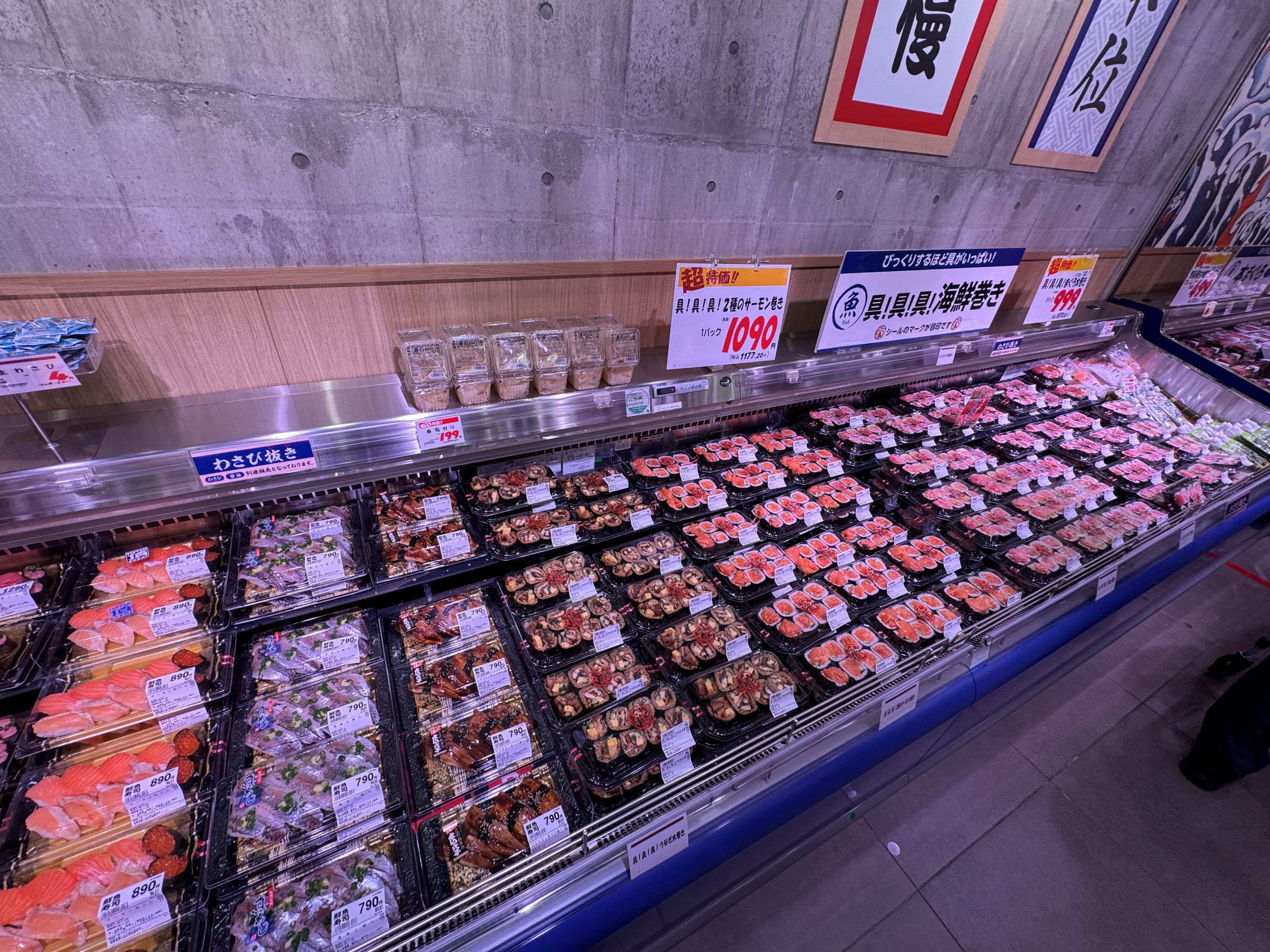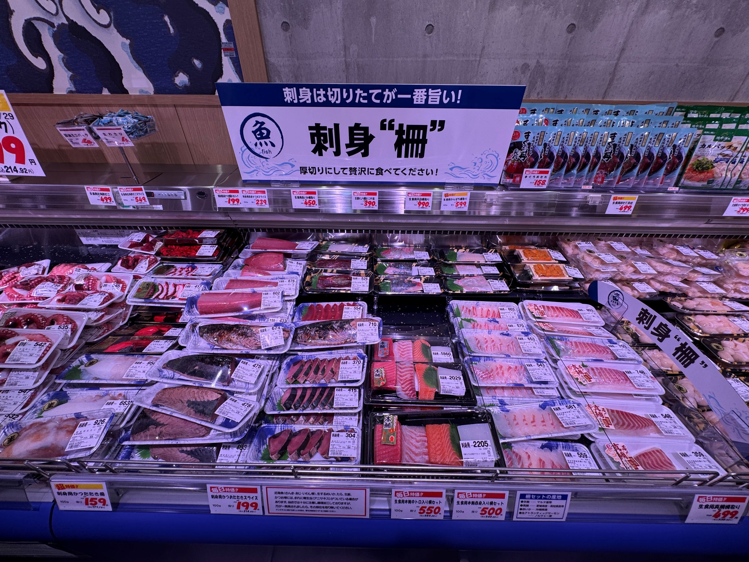一方で、寿司と並んで鮮魚の即食商品の代表的な存在である「刺身のスライス」については盛り合わせを品揃えしないなど極めて限定的な品揃えにとどめ、食べるときに何らかの加工が必要なサクを主体としている。サクでは特にマグロを大きくコーナー化。また、素材系の商品として、豊洲市場で買い付けした丸魚なども展開するが、対面販売などは実施せず、全てパック販売に特化。