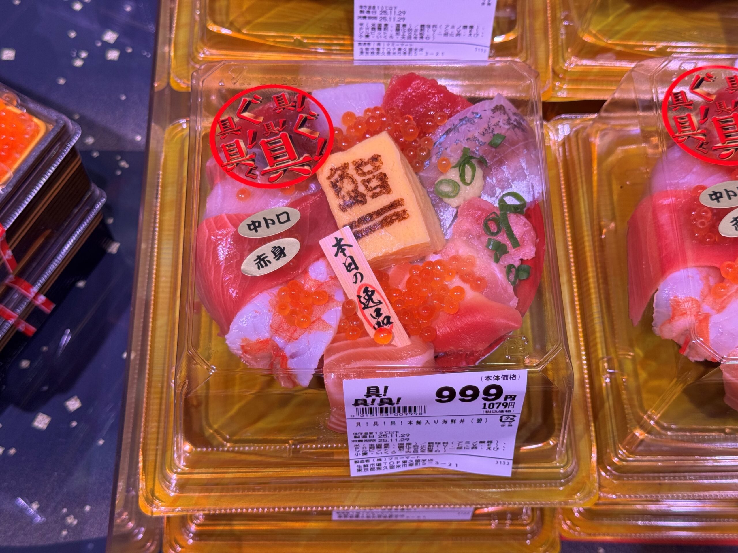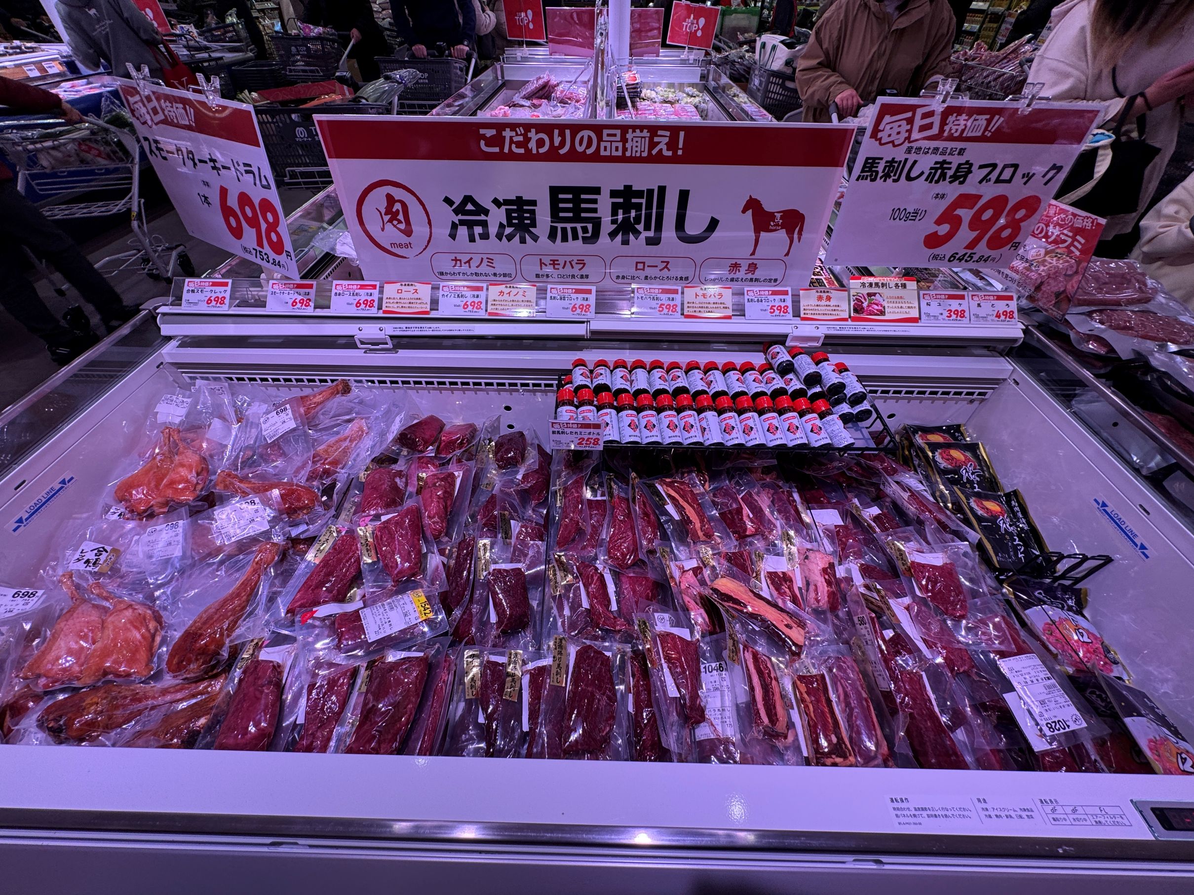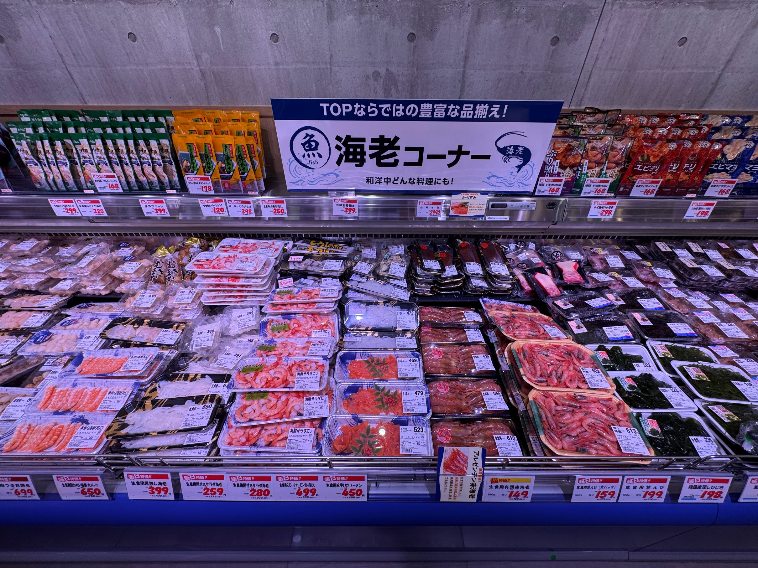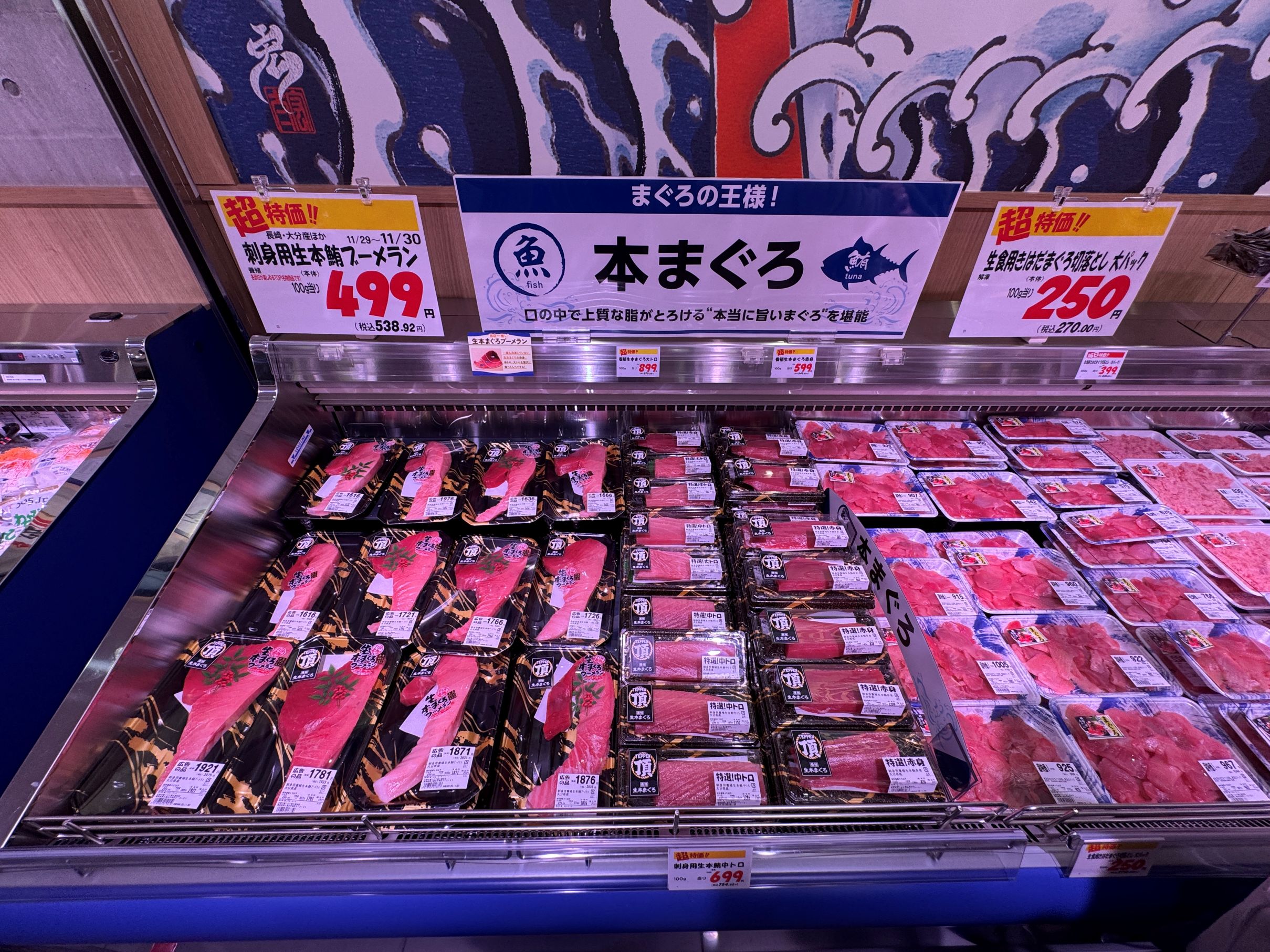 一方で、寿司と並んで鮮魚の即食商品の代表的な存在である「刺身のスライス」については盛り合わせを品揃えしないなど極めて限定的な品揃えにとどめ、食べるときに何らかの加工が必要なサクを主体としている。サクでは特にマグロを大きくコーナー化。また、素材系の商品として、豊洲市場で買い付けした丸魚なども展開するが、対面販売などは実施せず、全てパック販売に特化。