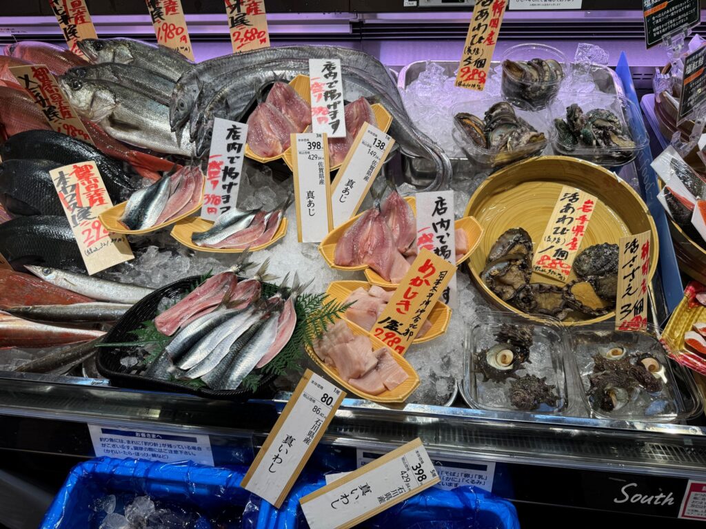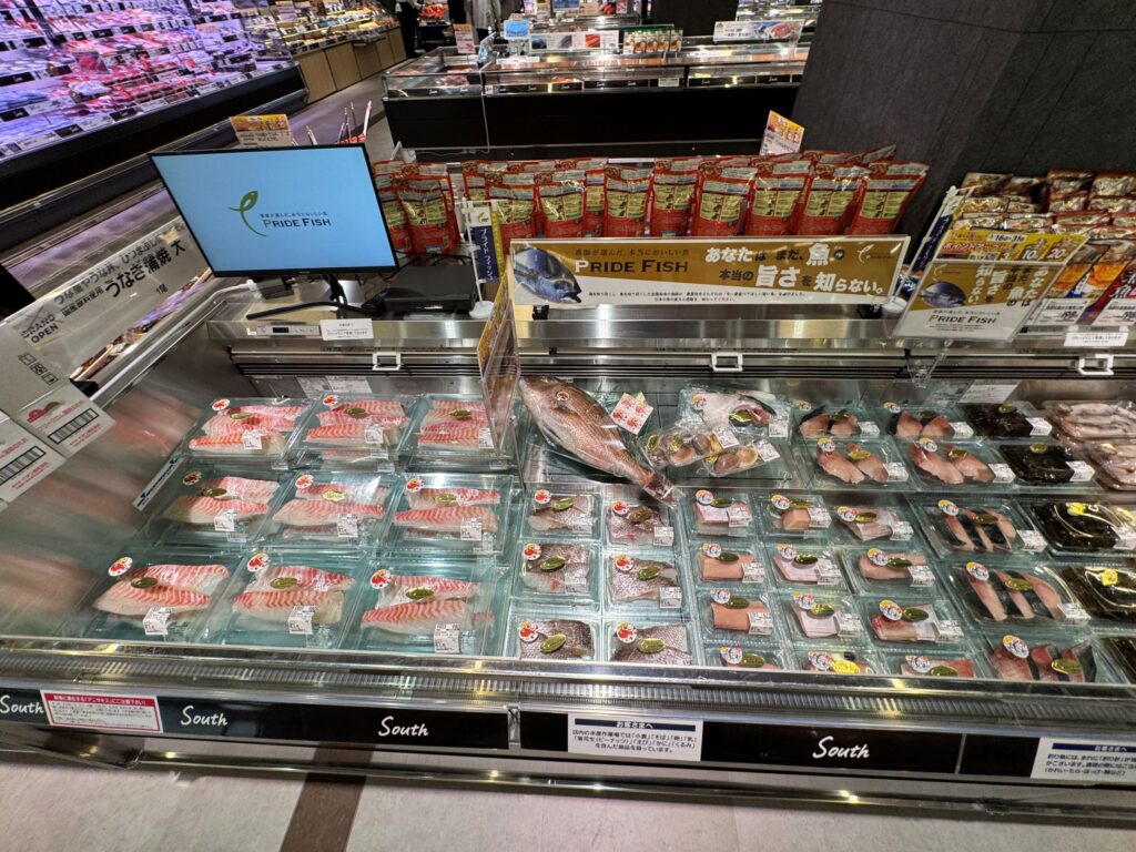 デリカ、ベーカリー、飲料など即食系で構成されていた1階に対し、地下1階は生鮮食品、日配品、冷凍食品の素材系の売場としている。農産ではカットしたての果実をふんだんに使ったカットフルーツやスイーツを品揃えする他、水産の鮮魚対面コーナーでは、季節に応じて漁師が選んだ「本当においしい自慢の魚」とのコンセプトの「プライドフィッシュ」をイオンで初めて対面で常時販売する(時間によって売り切れの場合もある)。