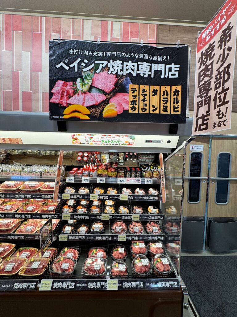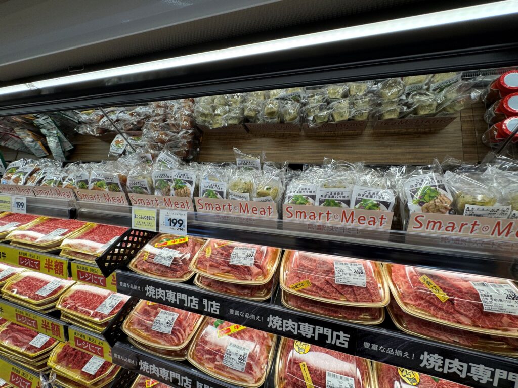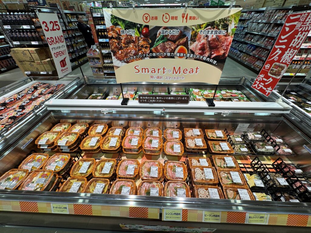 精肉売場ではベイシアオリジナルブランドの交雑牛の「とろ牛」に加え、埼玉県産の和牛「武州和牛」を新狭山店限定で展開。また、「ベイシア焼肉専門店」の看板を掲げ、素材、味付けのバリエーションをそろえた他、味付け肉、焼くだけ、レンジ調理、即食対応の「Smart Meat」など簡便商品も充実させた。