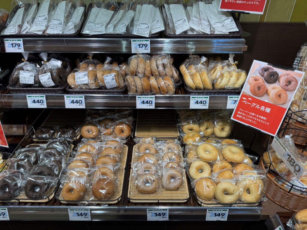 ベーカリーでは、クロワッサンやインストアバーガーに加え、新商品のベーグルもラインアップする。