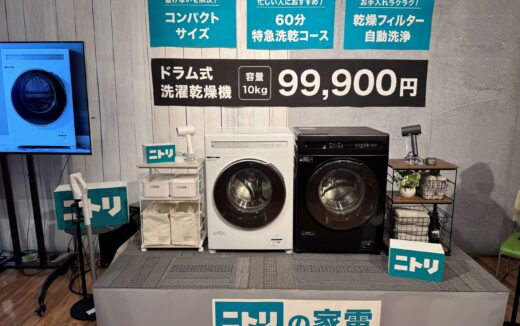 ニトリが10万円を下回る価格のドラム式洗濯乾燥機(標準洗濯容量10kg、標準乾燥容量5kg)の販売を11月22日からニトリ全店舗 … 続きを読む ニトリが税込み10万円を下回るドラム式洗濯乾燥機を発売、ニトリとして今後、家電を第4の柱に